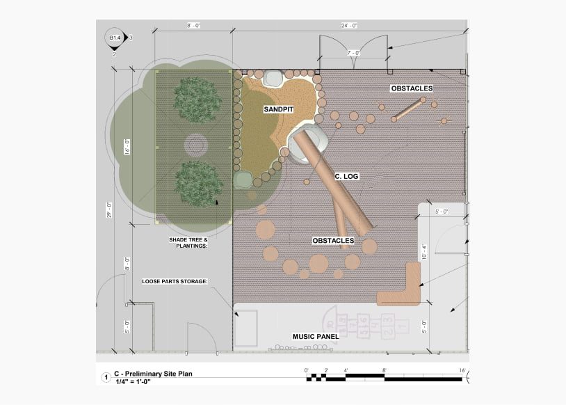 The site plan illustrates how the design team worked with the small site to find the optimum amount of play features, plants, and accessibility.