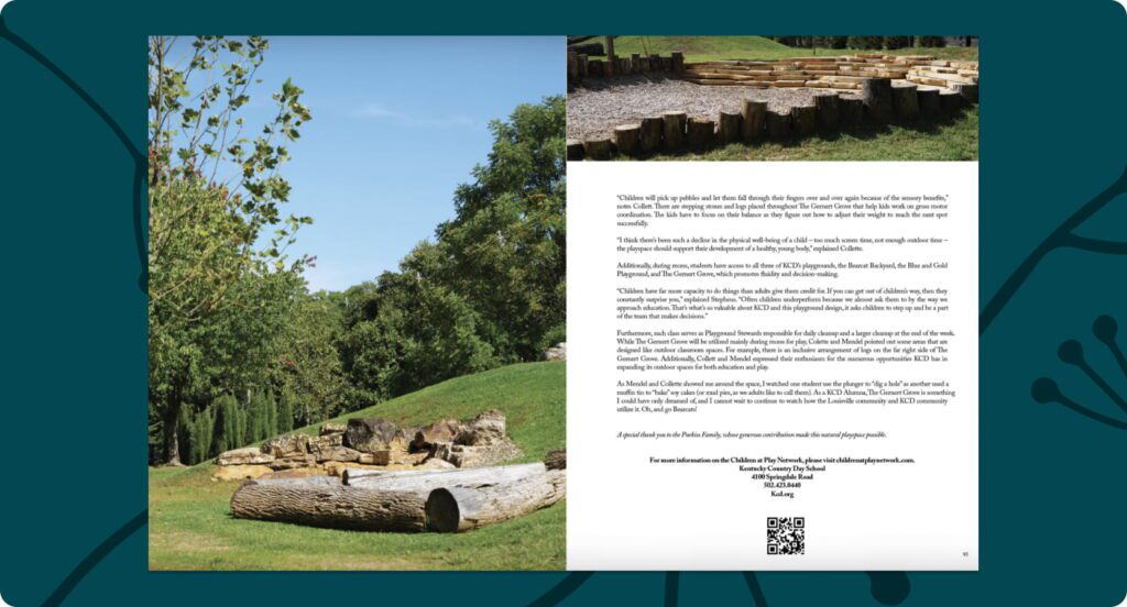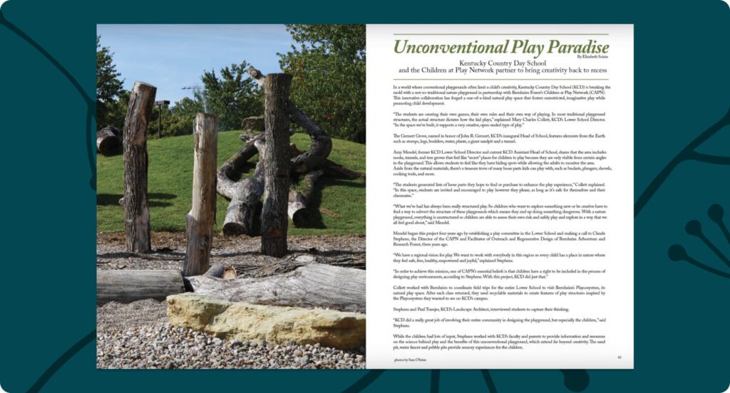 Kentucky Country Day School in Louisville, KY has been a longtime partner of the CAPN, and was the first organization to be awarded the Children at Play Network’s Project of Excellence award, highlighting their commitment to not only creating great nature play spaces, but also committing to teacher trainings, continuing education, and dedicating their program to the development of happy healthy children through play.