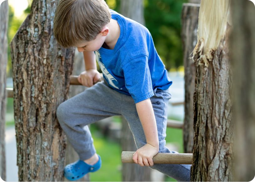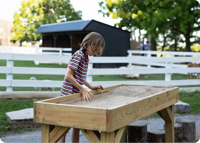 A child plays at a sand table, which provides a valuable sensory experience to children of all heights and abilities, with stepping stumps and wheelchair access.