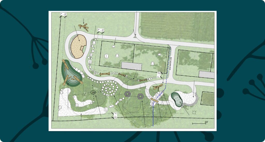 This site plan was used to convey the conceptual design of how the play elements would fit into the existing space, around various fences, trees, and pathways.