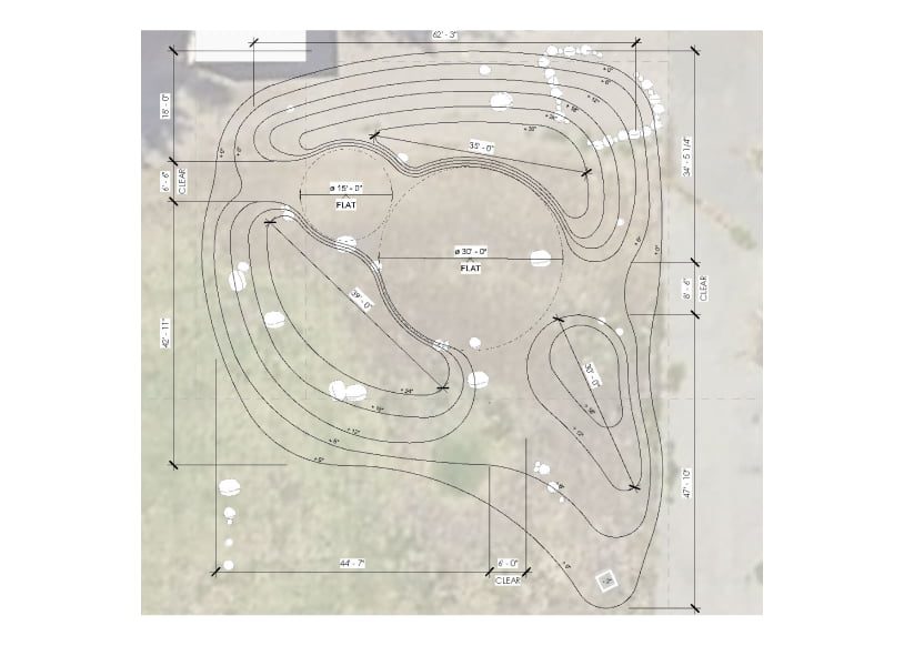 To turn a flat square corner of a field into a nature playspace, we designed an irregularly shaped footprint with raised mounds that create a more natural feeling environment.